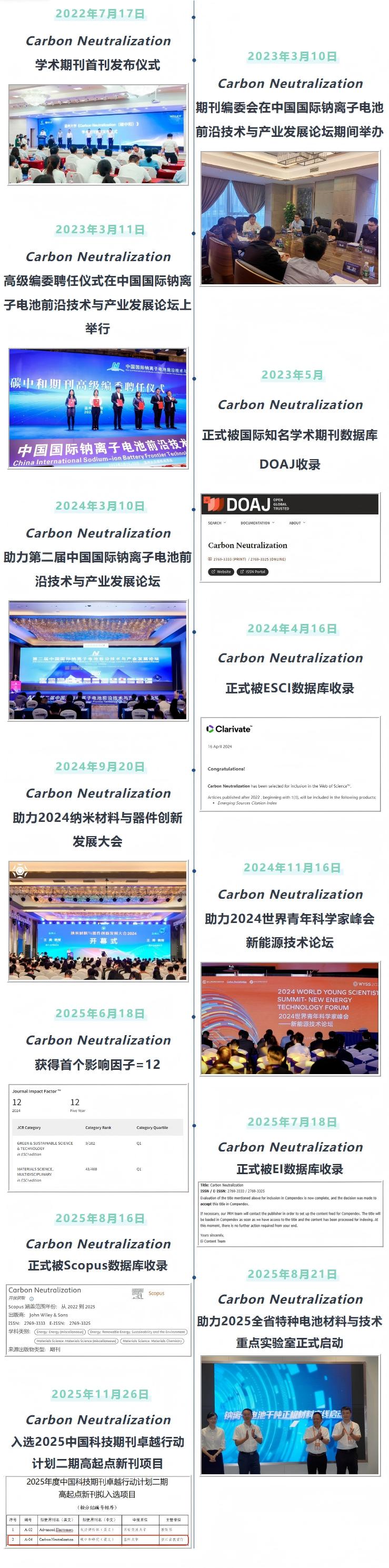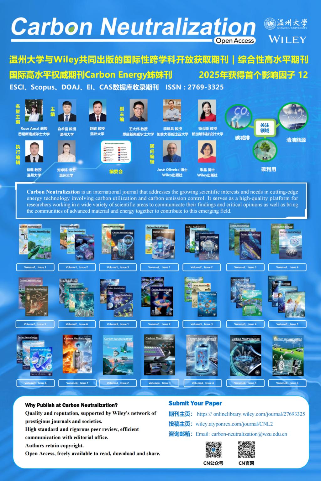Carbon Neutralization是温州大学与Wiley共同出版的国际性跨学科开放获取期刊,立志成为综合性旗舰期刊。期刊于2022年创刊,名誉主编由澳大利亚新南威尔士大学Rose Amal院士担任,主编由温州大学校长赵敏教授和温州大学碳中和技术创新研究院院长侴术雷教授担任,编委会由来自11个国家和地区的28名国际知名专家学者组成,其中编委会19位编委入选2025年度全球“高被引科学家”。且期刊已被ESCIScopusEICASDOAJ数据库收录,入选为中国科技期刊卓越行动计划二期高起点新刊,并于2025年获得首个影响因子 12